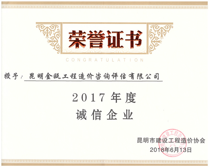 熱烈祝賀昆明金甌工程造價(jià)咨詢?cè)u(píng)估有限公司榮獲昆明市建設(shè)工程造價(jià)協(xié)會(huì):
