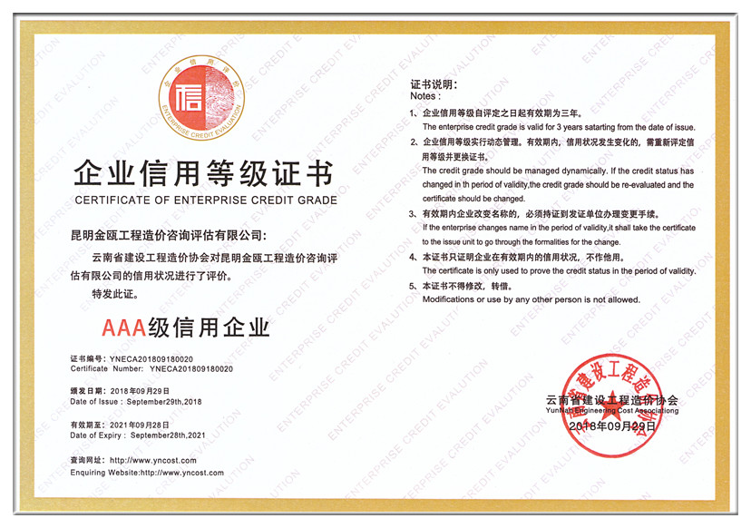2018年9月29日,中國建設工程造價管理協(xié)會對昆明金甌工程造價咨詢評估有限公司的信用狀況進行了評價,評定金甌公司為,并頒發(fā)了“企業(yè)信用等級AAA級信用企業(yè)”等級證書。