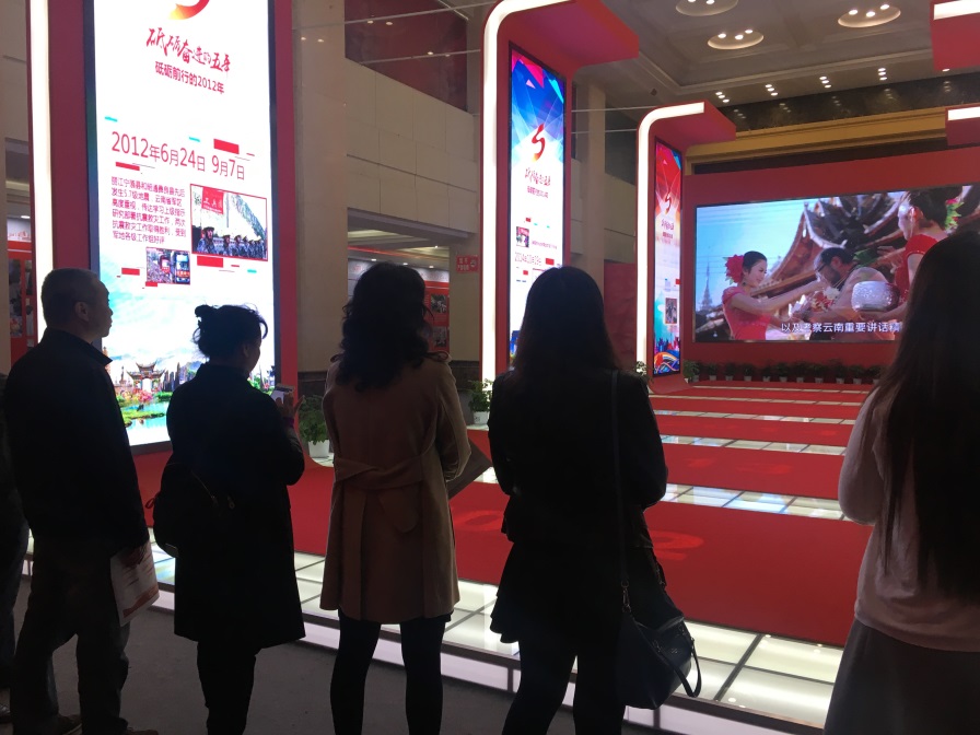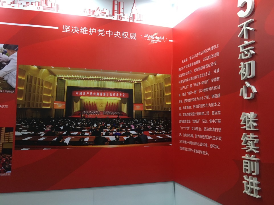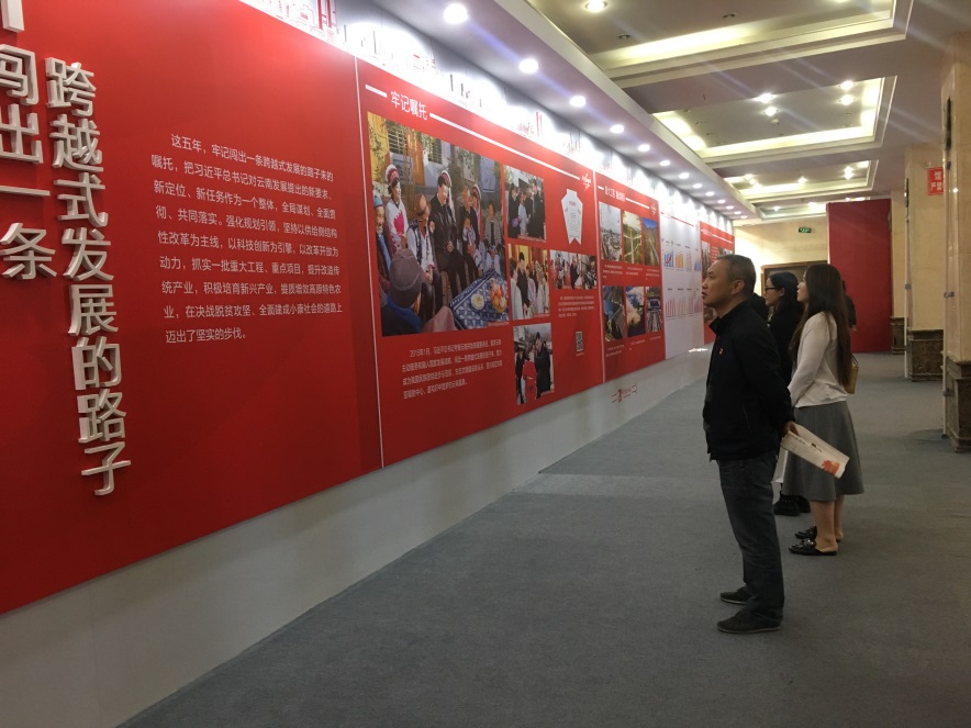 展覽分為闖出一條跨越式發(fā)展的路子、民族團(tuán)結(jié)進(jìn)步示范區(qū)、生態(tài)文明建設(shè)排頭兵、面向東南亞輻射中心、不忘初心繼續(xù)前進(jìn)等五個部分。展示了黨的十八大以來,省委、省政府團(tuán)結(jié)帶領(lǐng)全省各族人民深入學(xué)習(xí)貫徹習(xí)近平總書記系列講話精神和治國理政新理念、新思想、新戰(zhàn)略以及考察云南重要講話精神的實際行動。展示了云南社會經(jīng)濟(jì)發(fā)展的輝煌成就、各族群眾生活的新變化,以及省委從嚴(yán)治黨取得的成效。統(tǒng)籌推進(jìn)“五位一體”總體布局和協(xié)調(diào)推進(jìn)“四個全面”戰(zhàn)略布局,堅持以新理念引領(lǐng)經(jīng)濟(jì)發(fā)展新常態(tài),堅持發(fā)展第一要務(wù)和全面從嚴(yán)治黨主體責(zé)任兩手抓、兩手都要硬,全省經(jīng)濟(jì)社會和黨的建設(shè)等各項工作都取得了新成效、發(fā)生了新變化,在決戰(zhàn)脫貧攻堅、推動跨越發(fā)展,全面建設(shè)小康社會的道路上邁出了堅實的步伐。